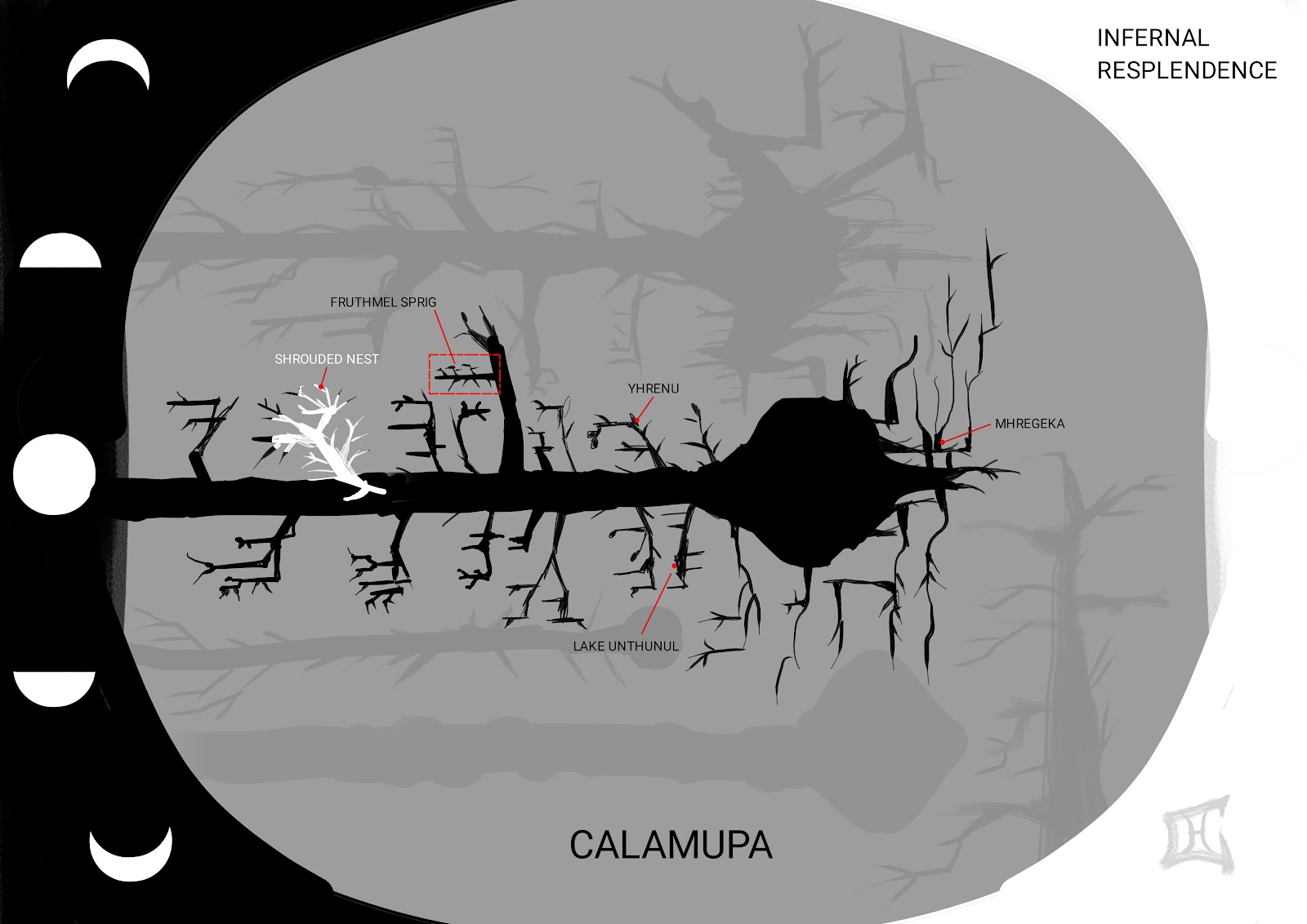A sketch of the world of Calamupa, with labels of all areas mentioned by each text in Lore24.